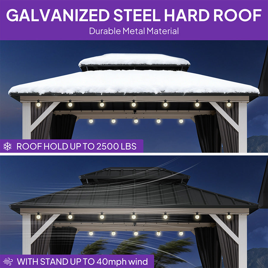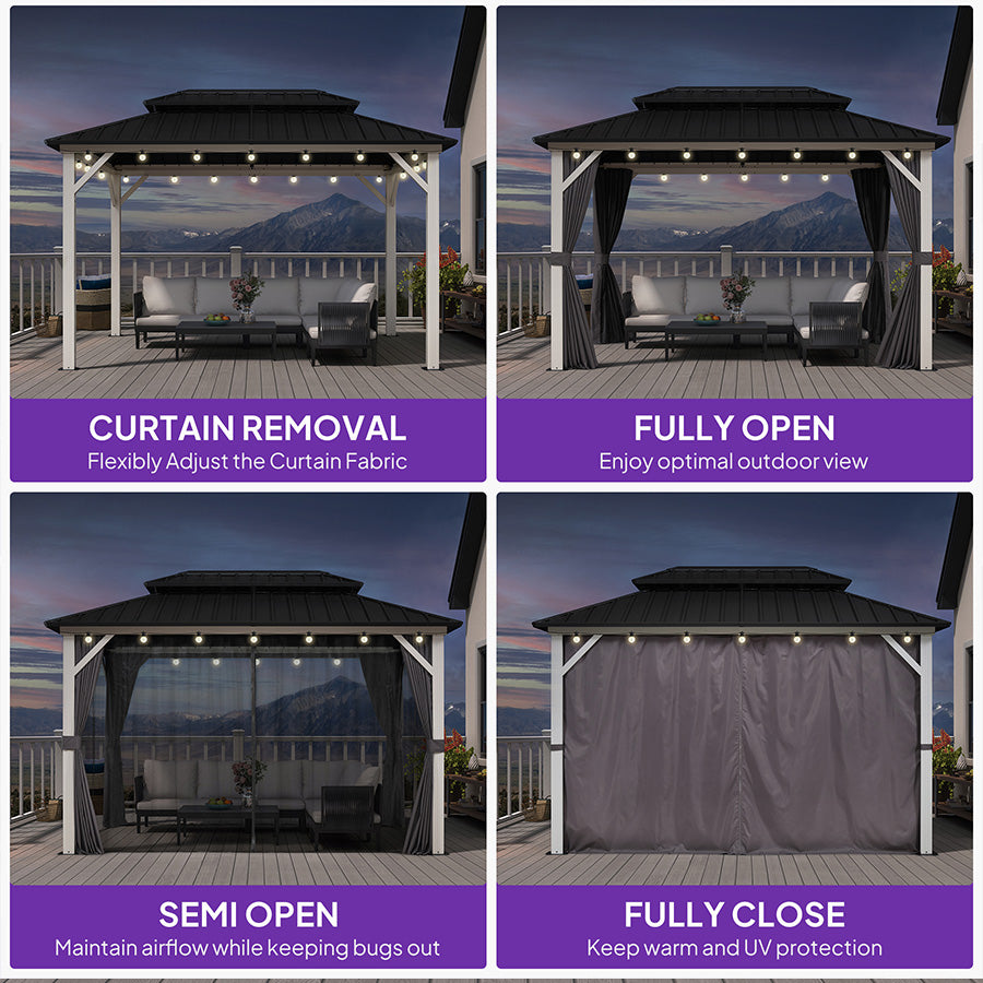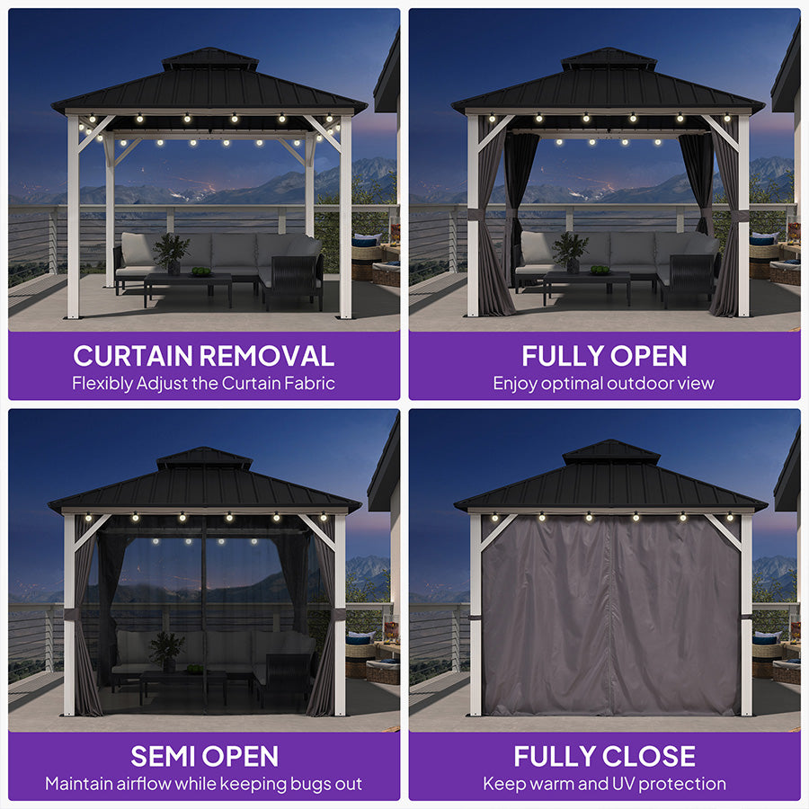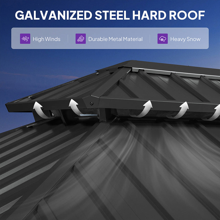 • [ Powder-coated Aluminum Frame ] Hardtop gazebo is constructed with a sturdy and lightweight aluminum framework, providing exceptional strength and durability. Make sure the gazebo is suitable for long-term outdoor use.