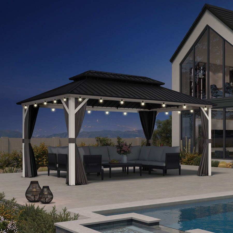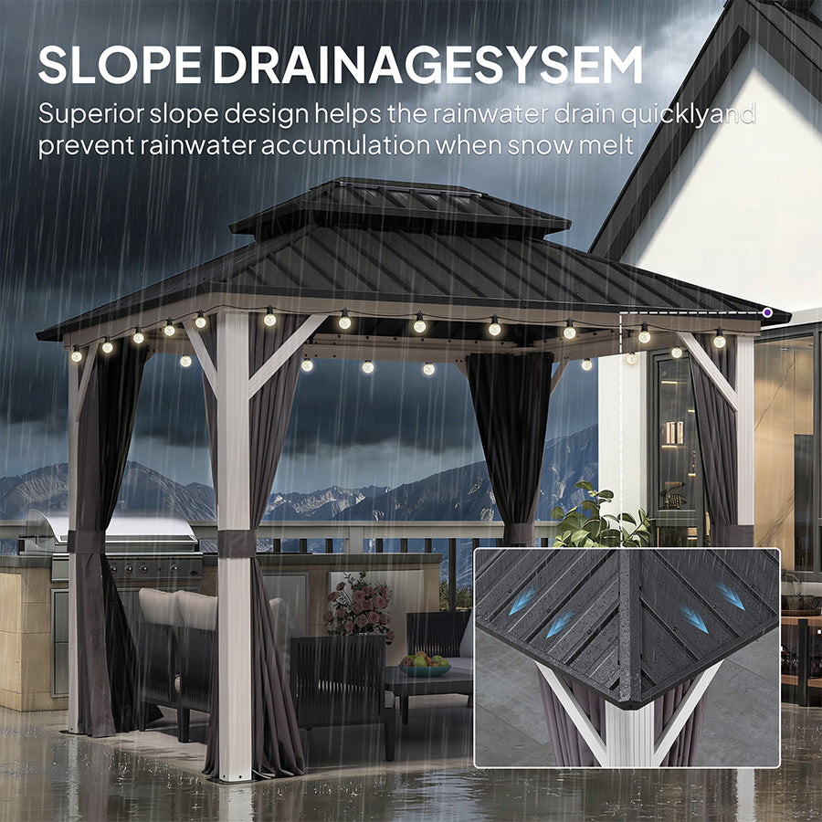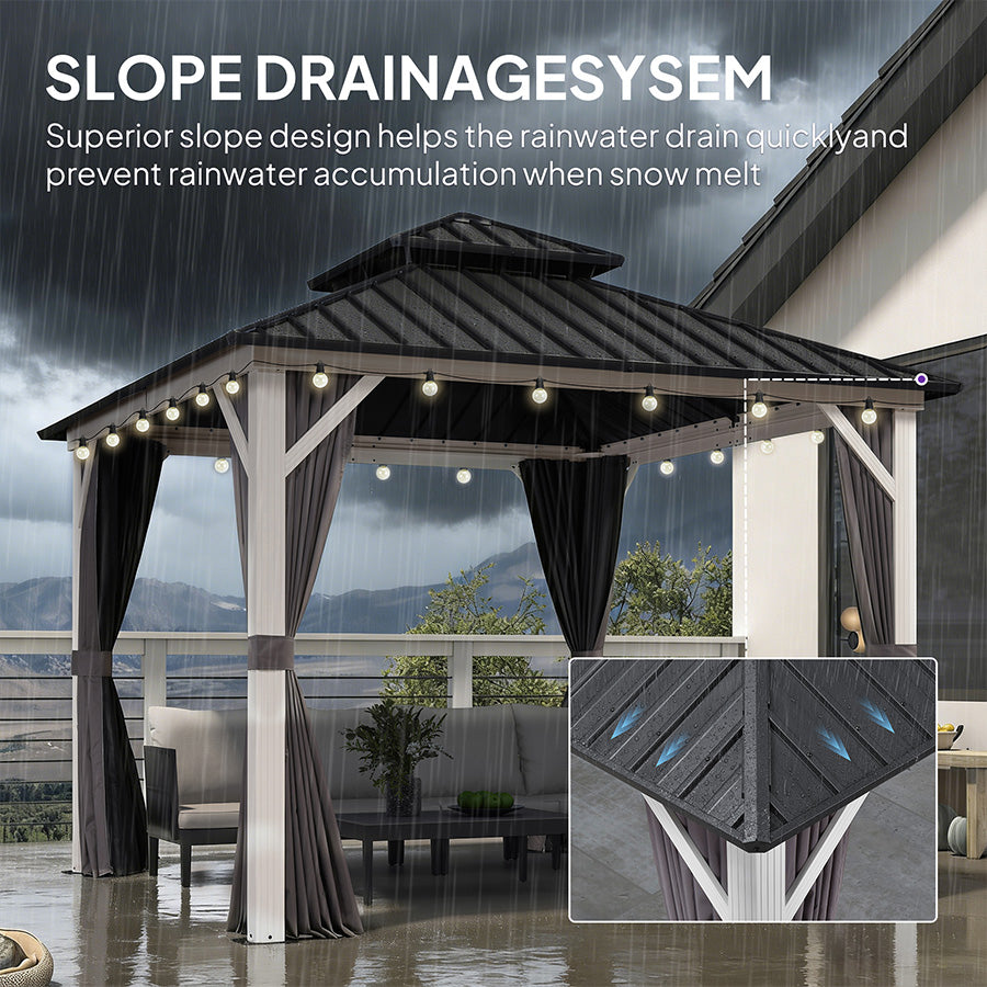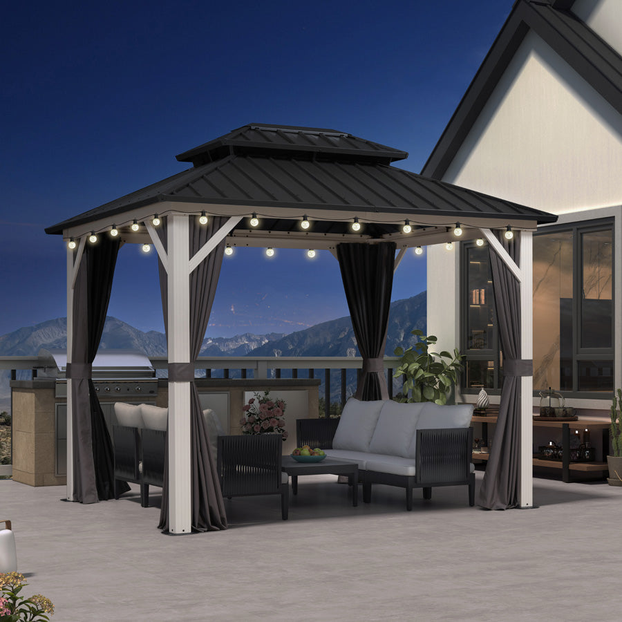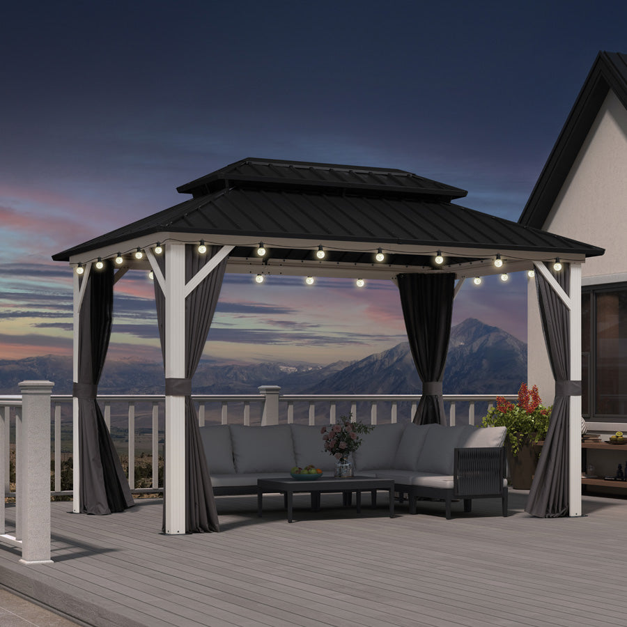 PURPLE LEAF Modern Gazebo Grey Hardtop Galvanized Steel Double Roof White Aluminum Poles with Curtains and Netting with Lights-clear