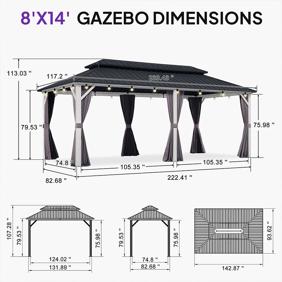 • [ Ceiling Hooks ] Comes with built-in, high-quality, sturdy ceiling hooks designed to easily hang your favorite chandelier or other decorative items. Outdoor gazebo can easily be transformed into a comfortable and light-filled gathering place to spend precious time with family and friends.
