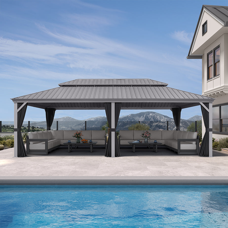- [ Sturdy Aluminum Frame ] Our outdoor aluminum gazebo features a robust powder-coated aluminum frame. The included 12 expansion screws secure the gazebo in solid areas like concrete, adding extra durability and safety for stability in severe weather.