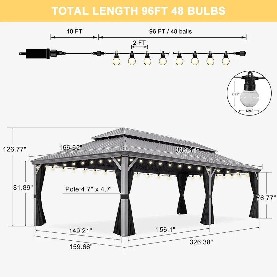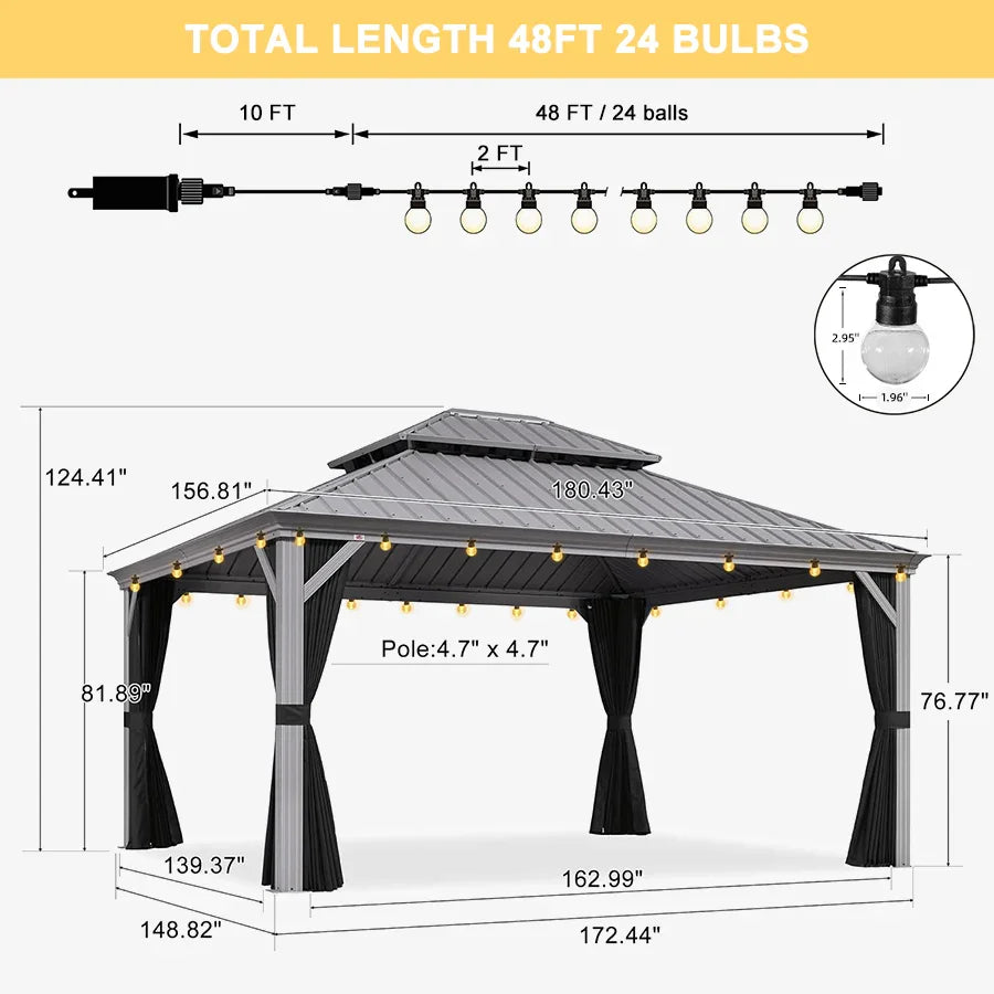 - [ Sturdy Aluminum Frame ] Our outdoor aluminum gazebo features a robust powder-coated aluminum frame. The included 12 expansion screws secure the gazebo in solid areas like concrete, adding extra durability and safety for stability in severe weather.