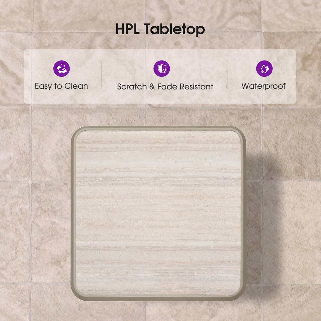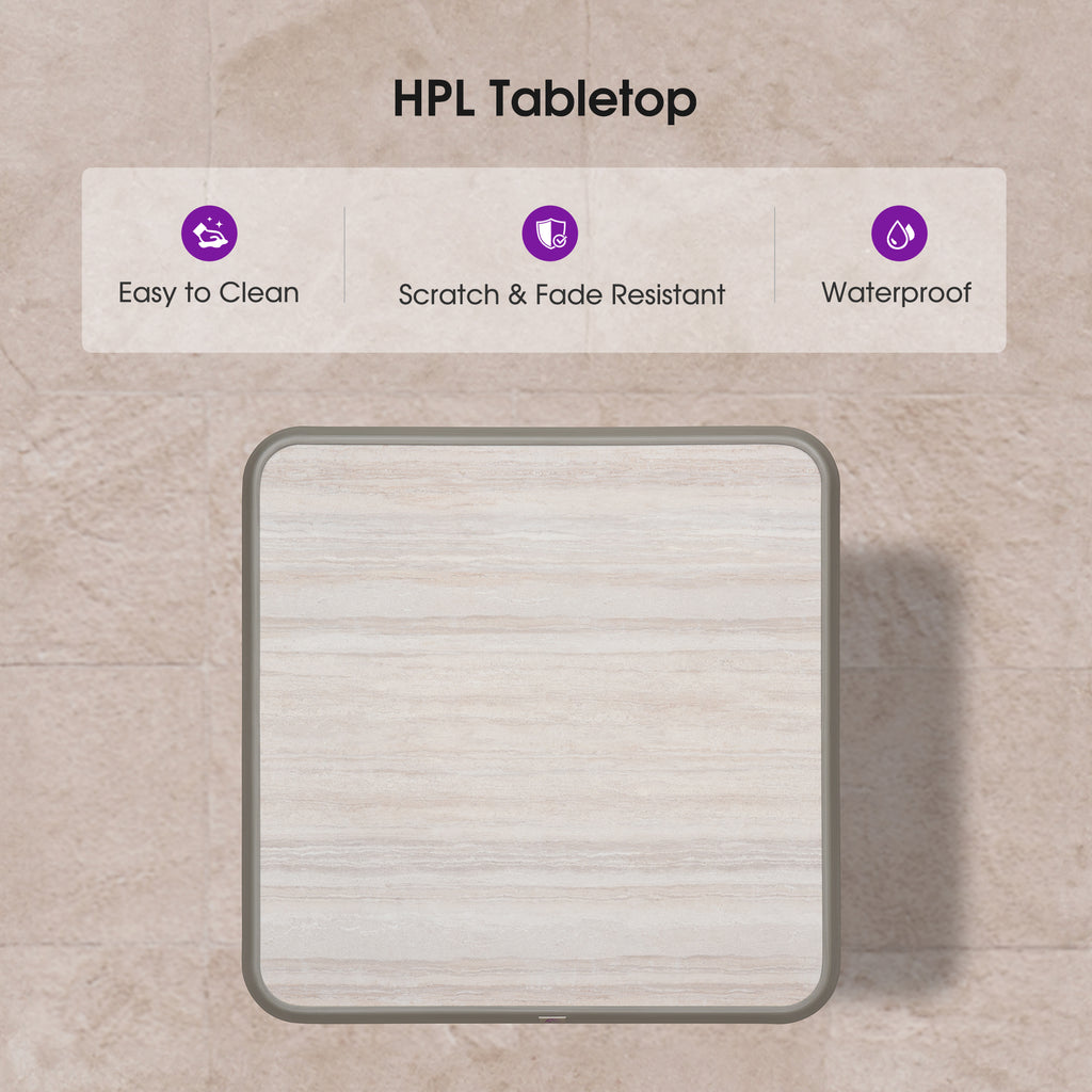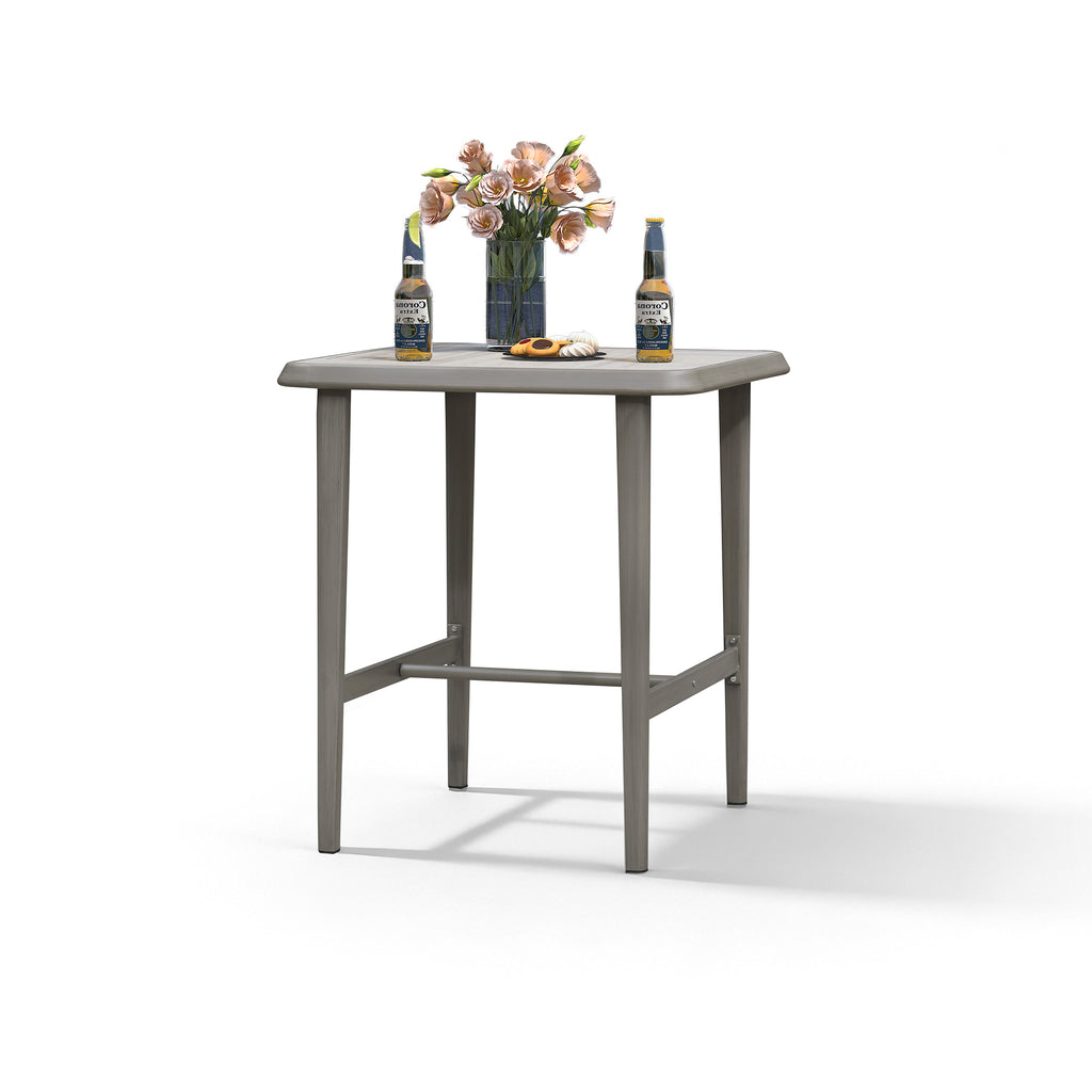 [ HPL Tabletop ] Crafted from HPL materials, the tabletop of this aluminum bar table is fade and scratch resistant for long-term outdoor use.