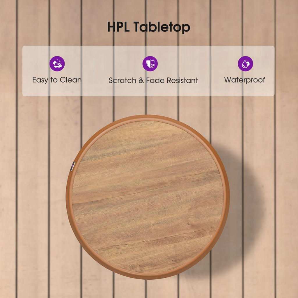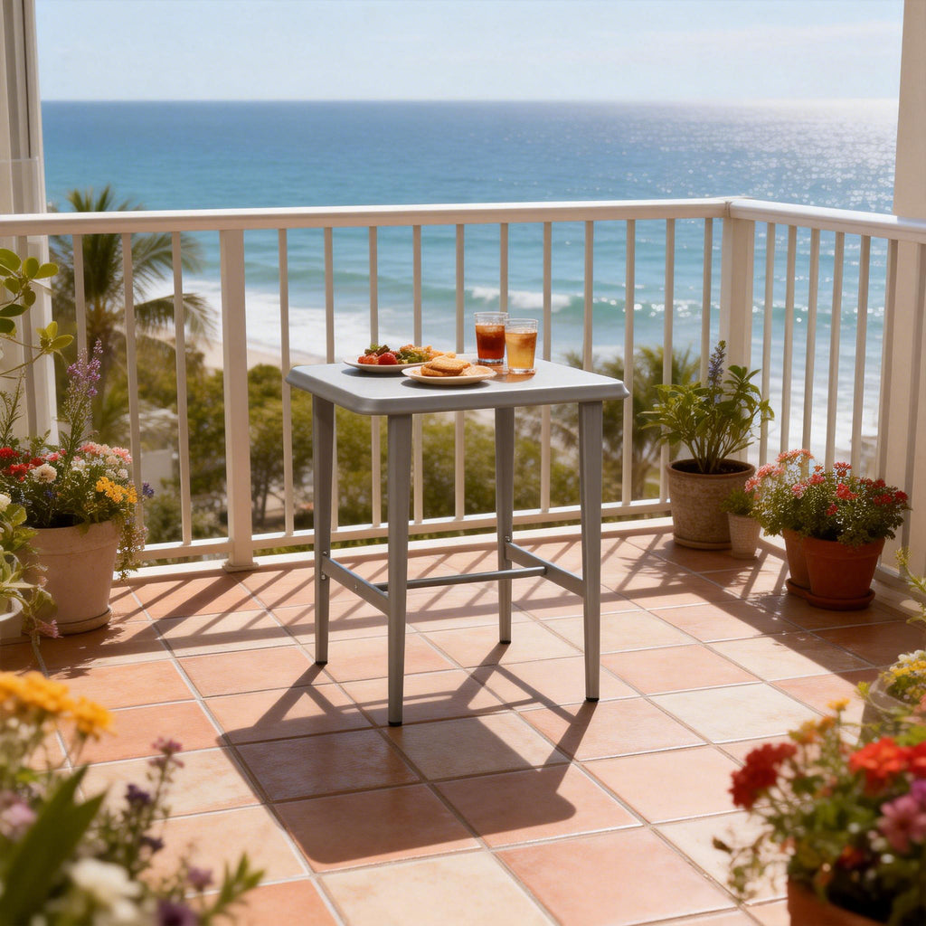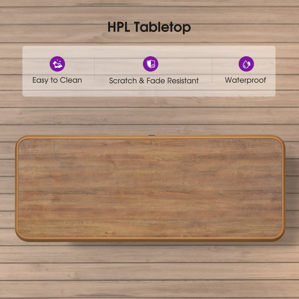 [ HPL Tabletop ] Crafted from HPL materials, the tabletop of this aluminum bar table is fade and scratch resistant for long-term outdoor use.