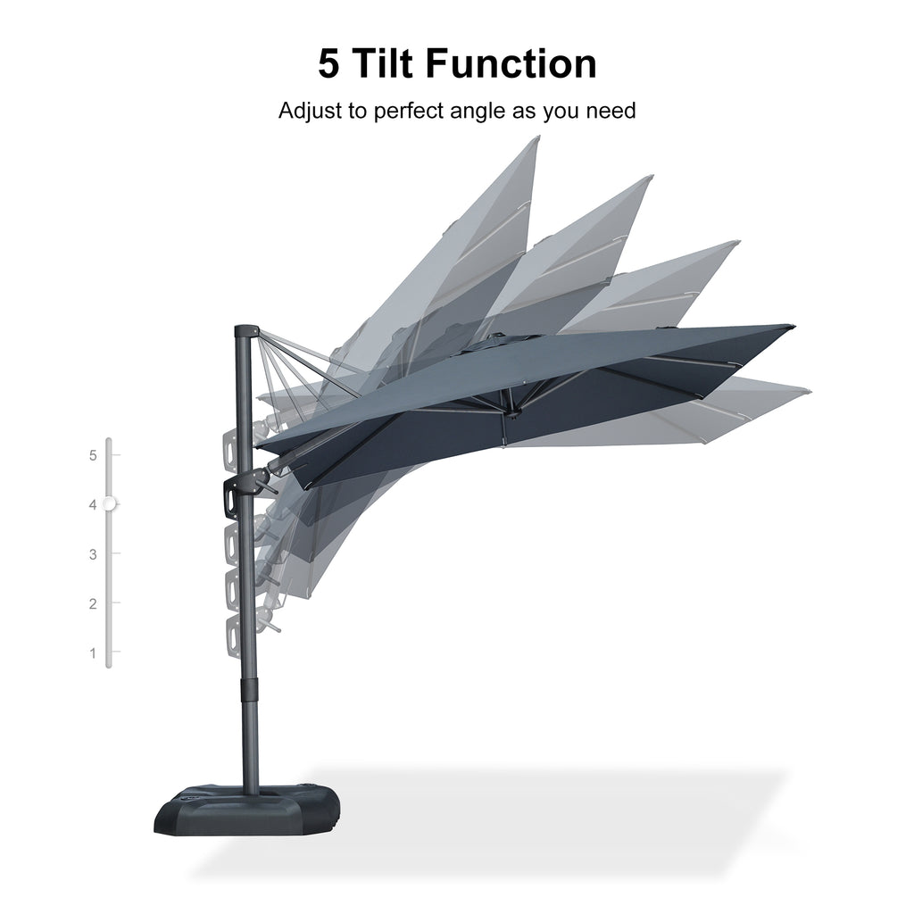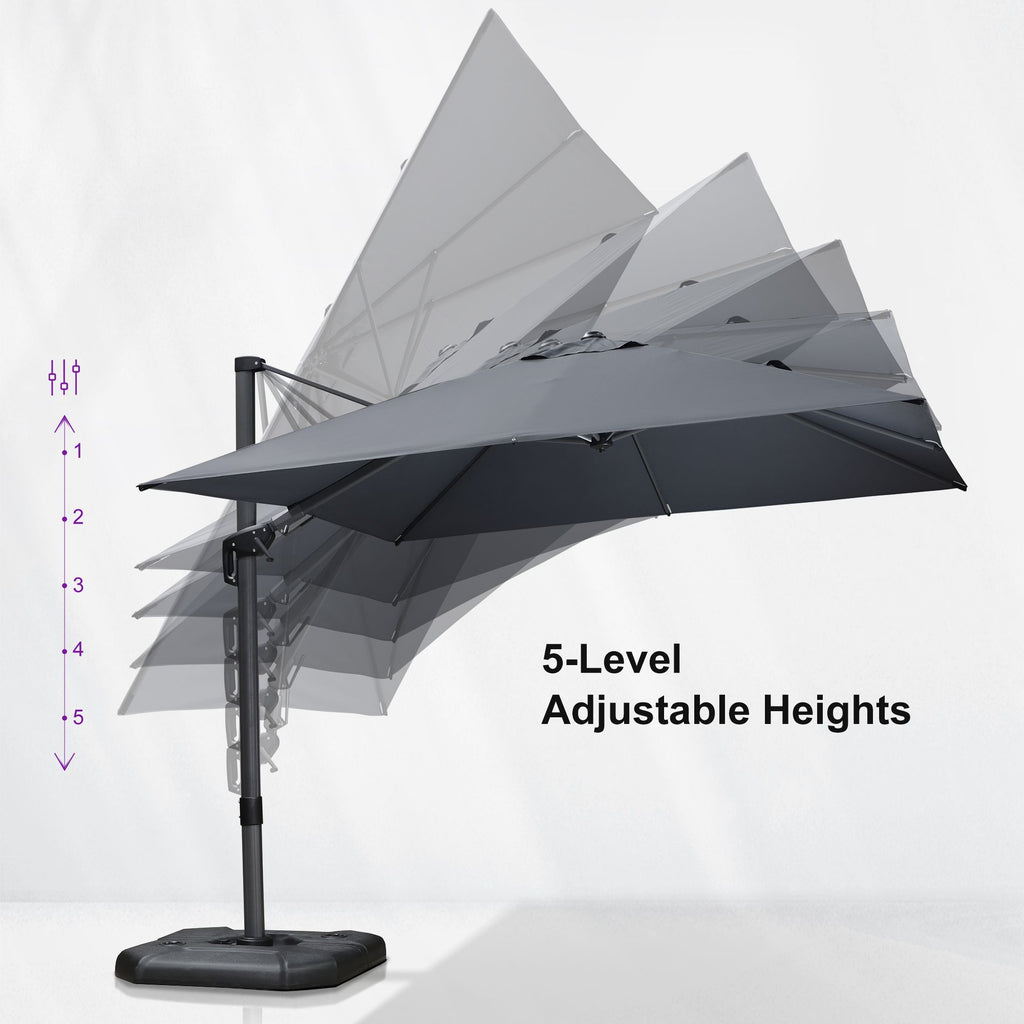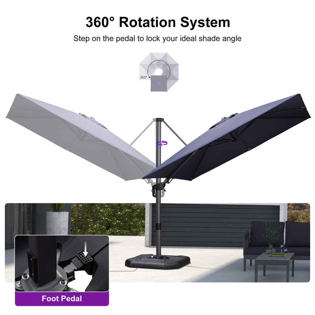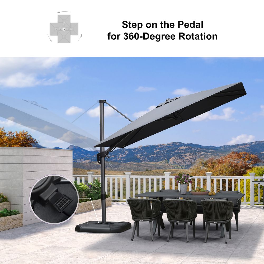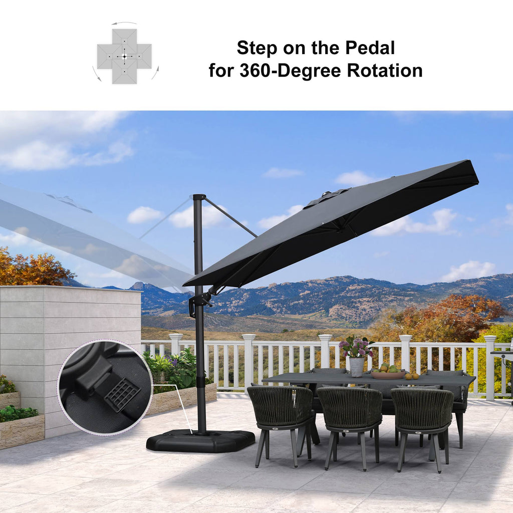The PURPLE LEAF Cantilever Umbrella blends style with everyday practicality. Comes with a base for easy purchase and hassle-free installation. With up to 60° left-right tilt and full 360° rotation, the canopy effortlessly follows the sun to provide all-day shade. Its sturdy cantilever aluminum frame ensures reliable performance, perfect for poolside lounging, patio relaxation, or backyard dining.