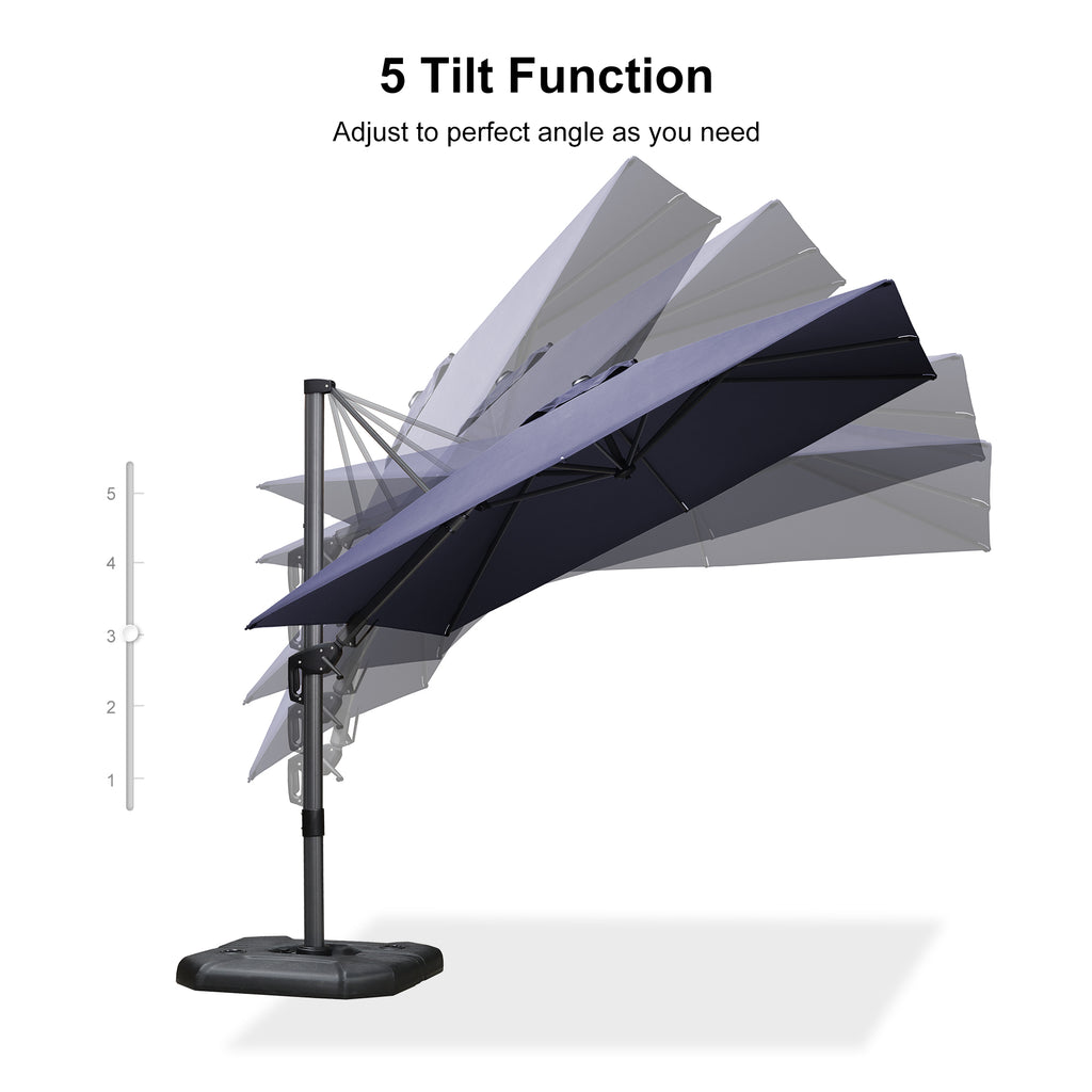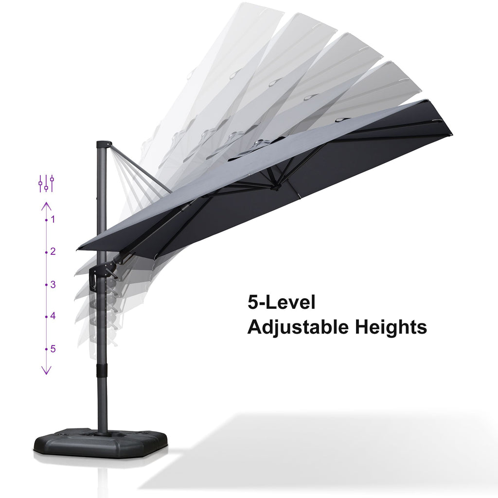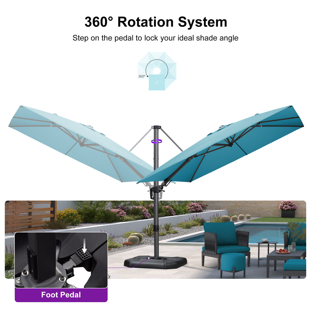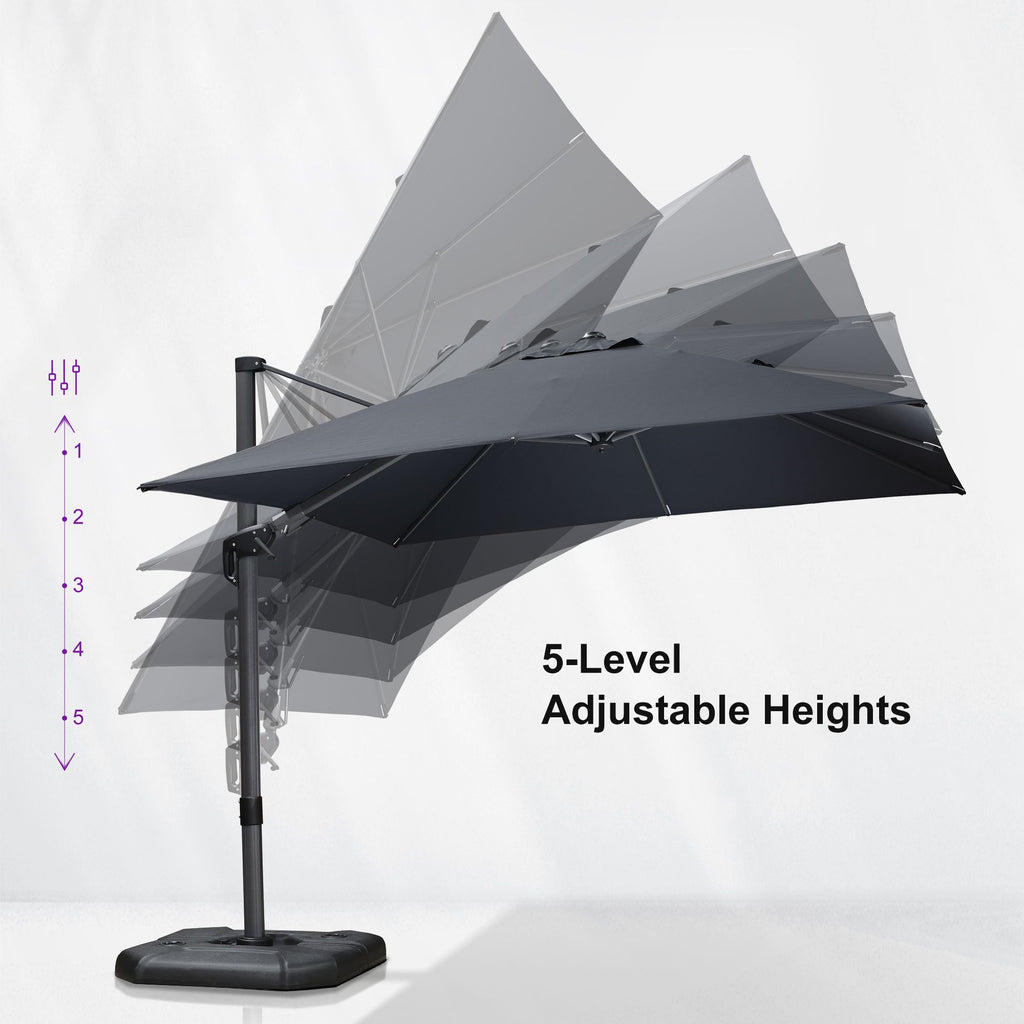 The PURPLE LEAF Cantilever Umbrella blends style with everyday practicality. Comes with a base for easy purchase and hassle-free installation. With up to 60° left-right tilt and full 360° rotation, the canopy effortlessly follows the sun to provide all-day shade. Its sturdy cantilever aluminum frame ensures reliable performance, perfect for poolside lounging, patio relaxation, or backyard dining.