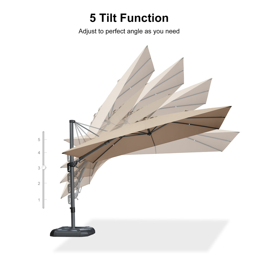 ● New Tilt Design: The easy-tilt system of this tilt umbrella allows you to adjust the canopy angle up to 60° to the left or right, keep the shade as the sun moves throughout the day, and adjust the angle you want whenever you want.