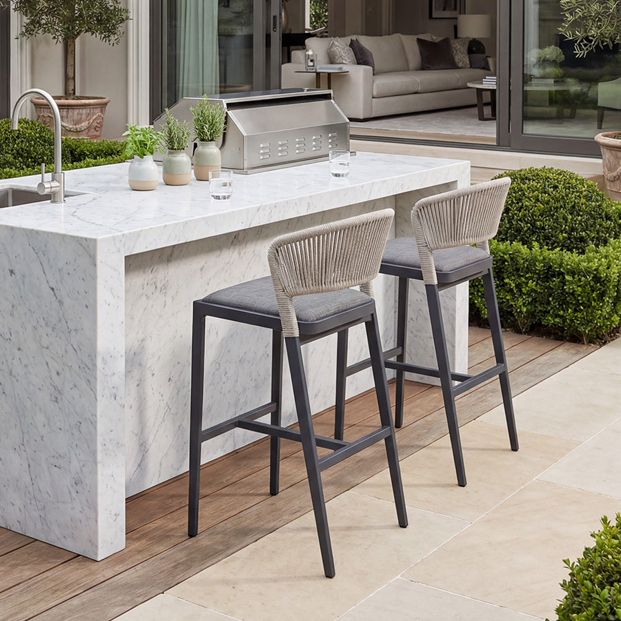 【Modern Style】 Combining a teak-finished aluminum frame with a beautiful rattan weave, this bar stool chair will be an ideal modern accessory for your outdoor space.