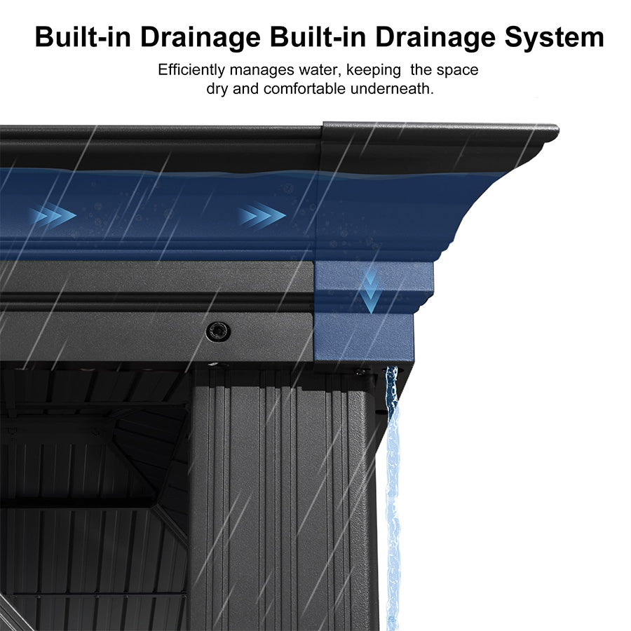 - [ Drainage System Design ] Reasonably sloped roof designed to allow water to drain quickly,and the water gutter design ensures rainwater flows out of the edges of the frame and poles.