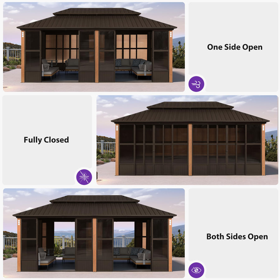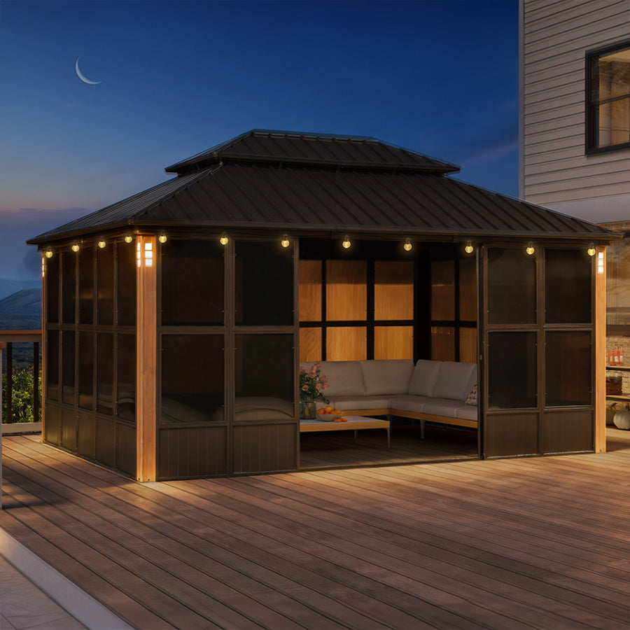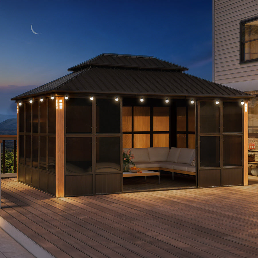 PURPLE LEAF Bronze Frame Sunroom Hardtop Gazebo Solarium Wood Grain Columns Galvanized Steel Double Roof All-Weather Screen House with Lights