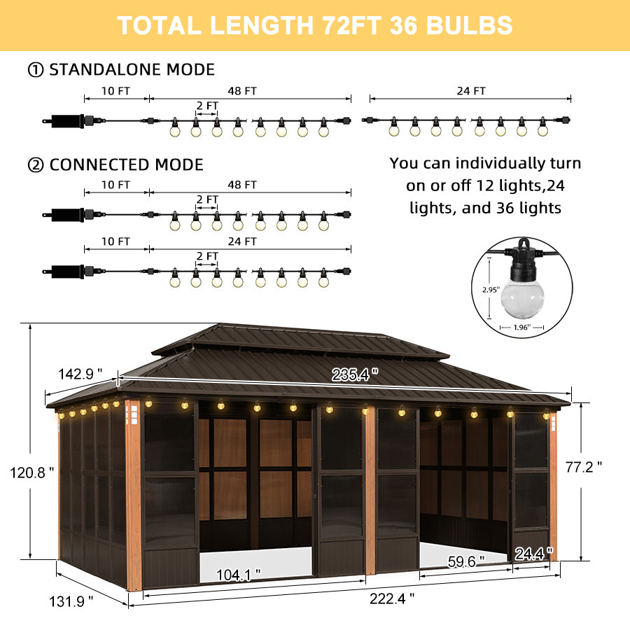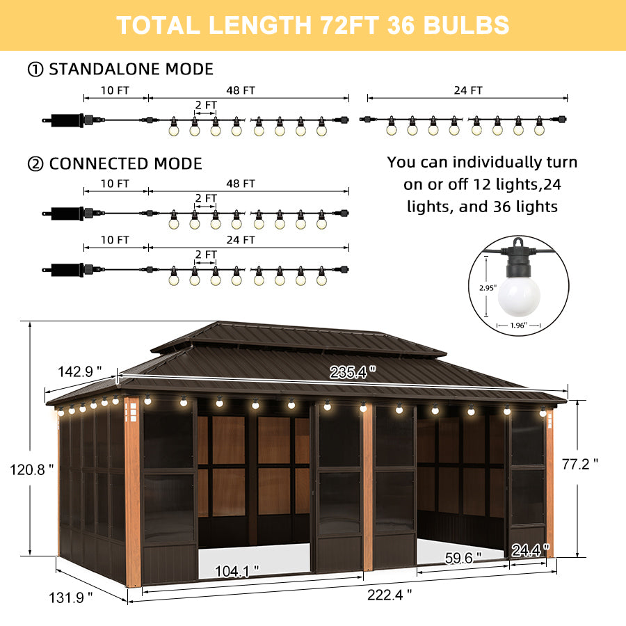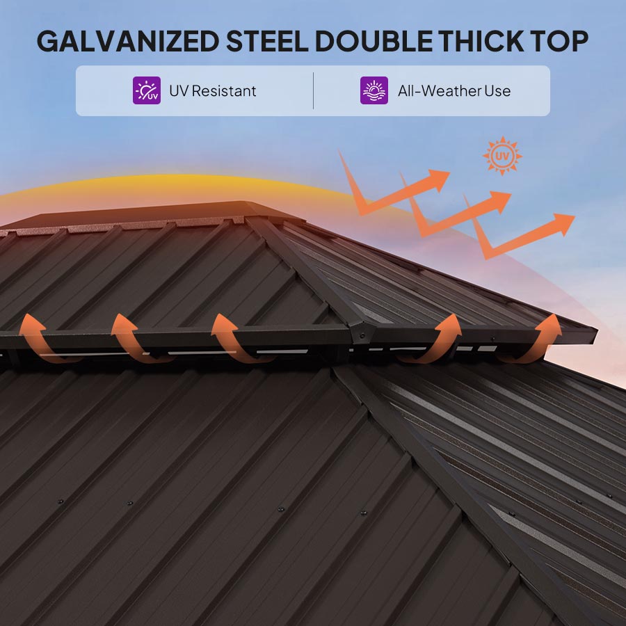 • [ Double Top Design ] The roof is double top vented for optimum airflow and comfort. Galvanized steel roofs make the gazebo rust and weather-resistant.