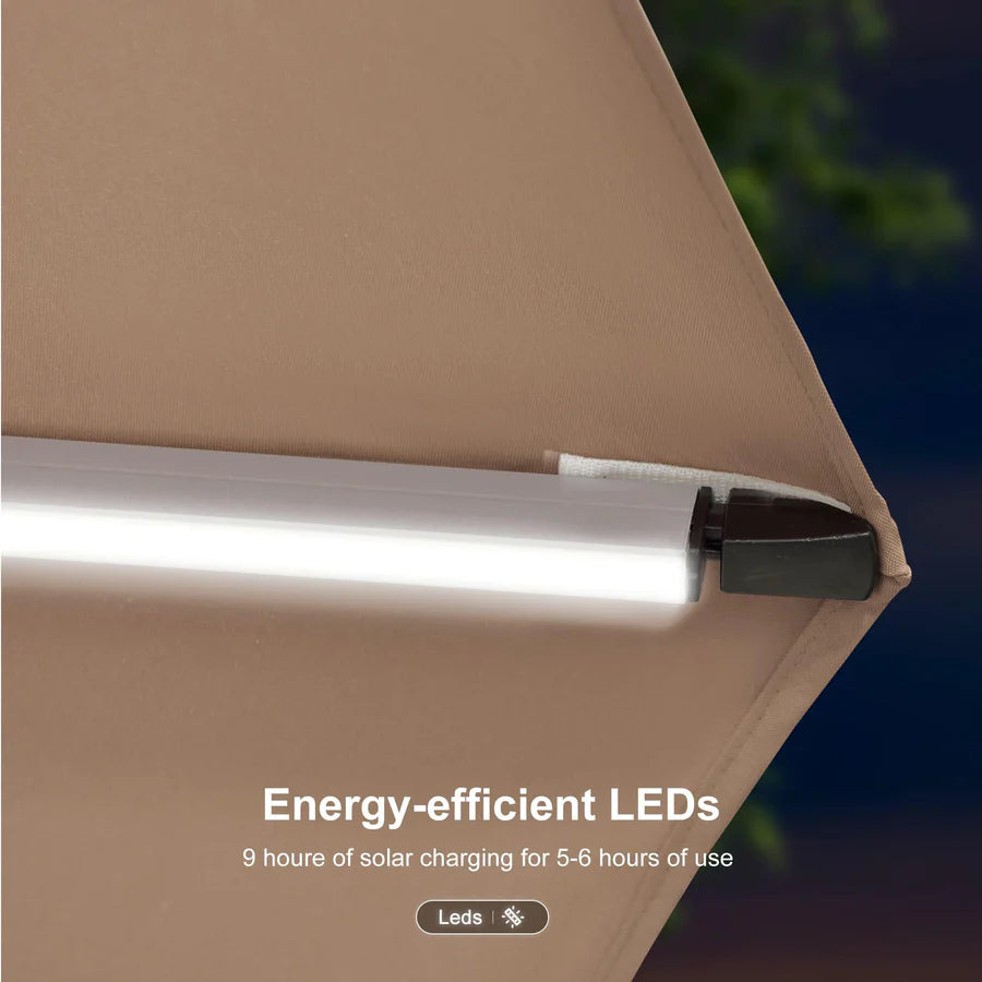● Unique Lighting: LED strips with 3200K and 4200K color temperatures are embedded within the umbrella ribs. By leveraging the strengths of warm white and neutral white light, this achieves a “1+1>2” lighting effect. Seven integrated umbrella ribs with light strips, featuring a central light added at the middle, illuminate both the center and surrounding areas to create a warm nighttime ambiance. This exceptional lighting is exceptionally warm and comfortable, ideal for evenings, dining areas, and relaxation zones.