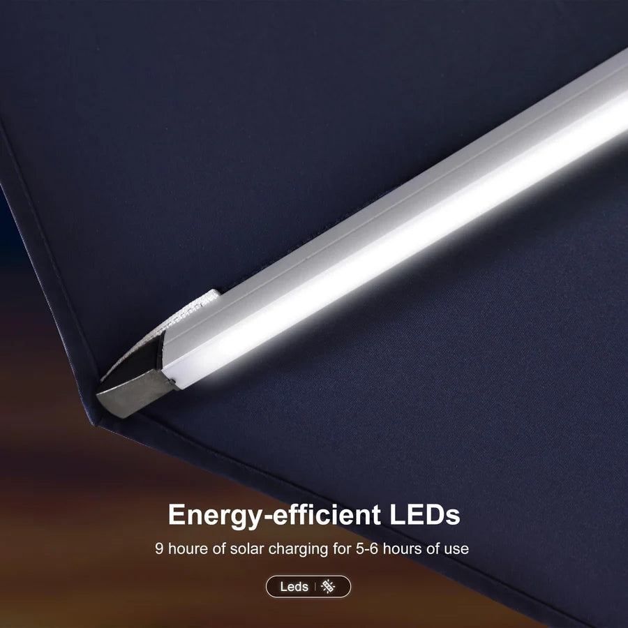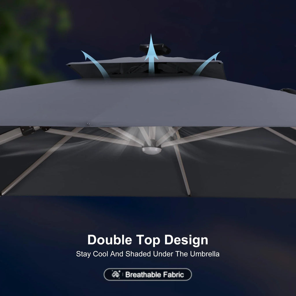The PURPLE LEAF Double-Top Cantilever Sunbrella Umbrella features an integrated luxury LED lighting system. Its solar panels atop the canopy efficiently capture sunlight for power, delivering dual functionality in one purchase. During the day, adjust the angle to shield against the harsh sun. At night, illuminate your dark backyard, creating a romantic ambiance for post-dinner relaxation.