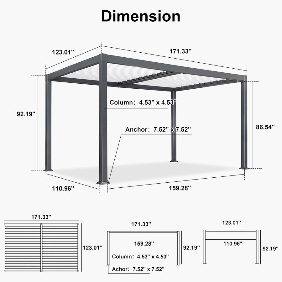 · Independent Adjustable Roof: With two rows of individually controlled louvered roofs, you can enjoy up to 120-310 square feet of shade while still being able to bask in the sun or gaze at the stars with this patio pergola.