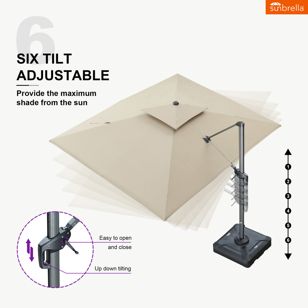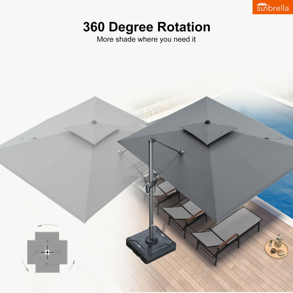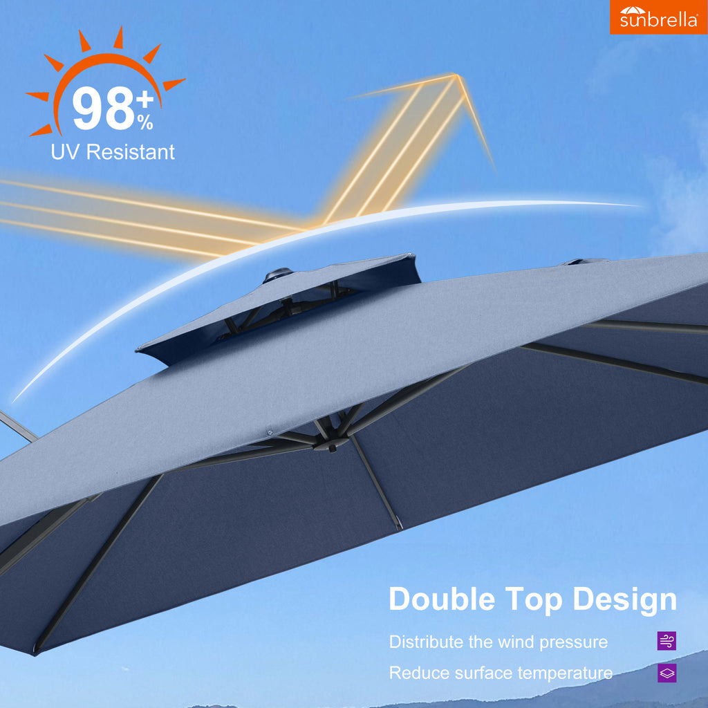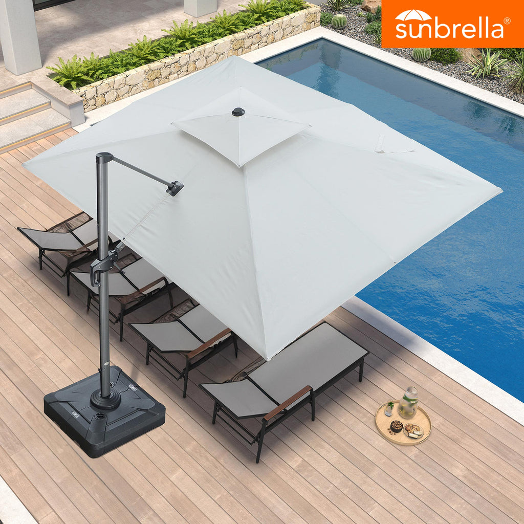 PURPLE LEAF Double Top Cantilever Umbrella is the perfect blend of style and practicality, this large dual top pool umbrella offers 360° rotation and 6 height tilts. Featuring a dual canopy system for excellent shade, the cantilever design eliminates the need for a center pole, providing you with a clear view and plenty of unobstructed seating space.