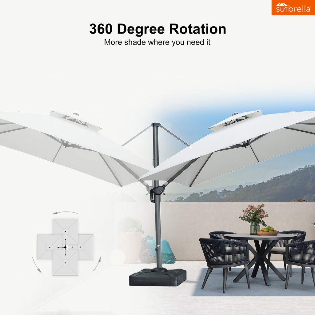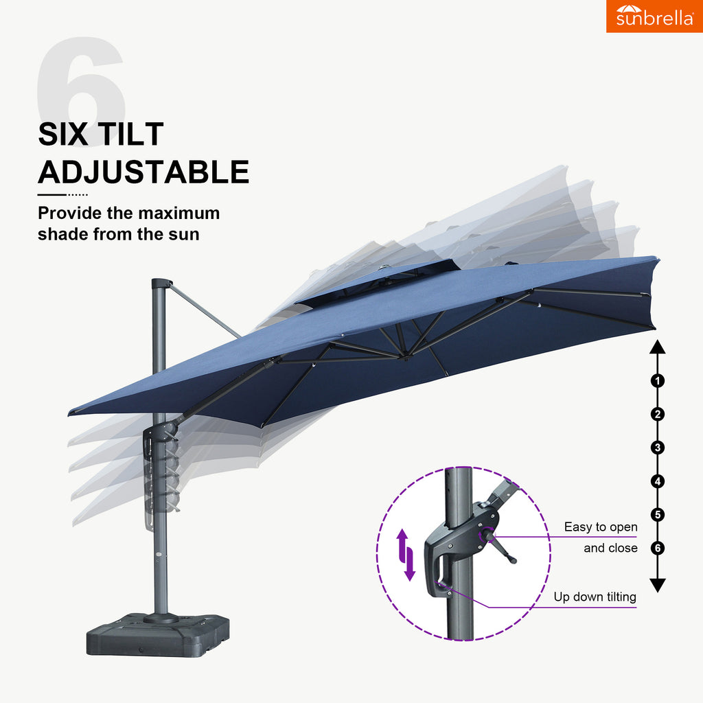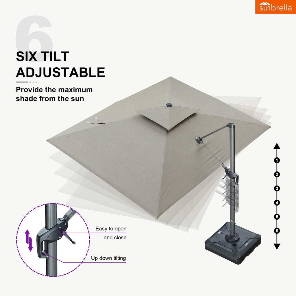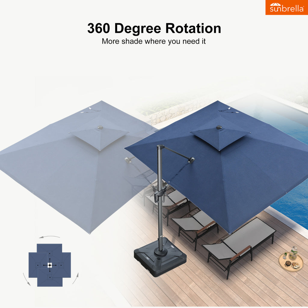 PURPLE LEAF Double Top Cantilever Umbrella is the perfect blend of style and practicality, this large dual top pool umbrella offers 360° rotation and 6 height tilts. Featuring a dual canopy system for excellent shade, the cantilever design eliminates the need for a center pole, providing you with a clear view and plenty of unobstructed seating space.