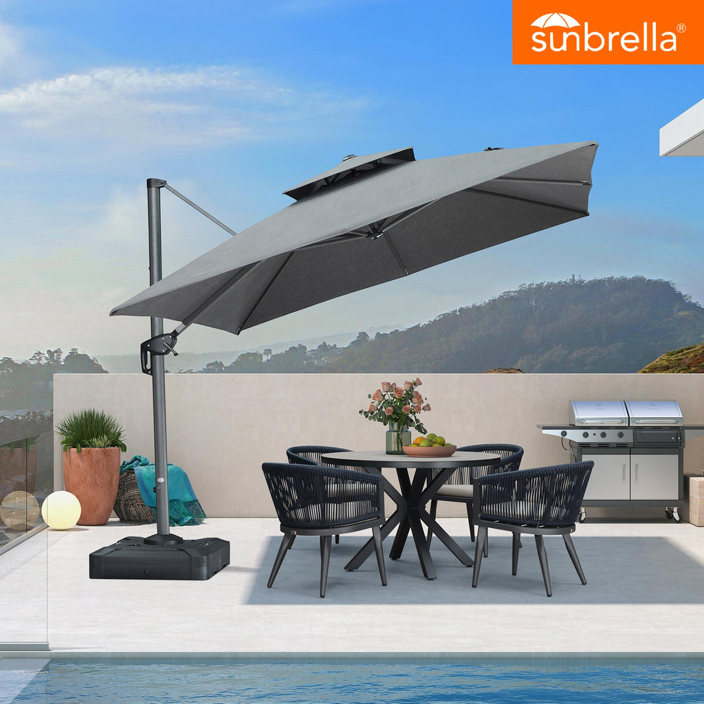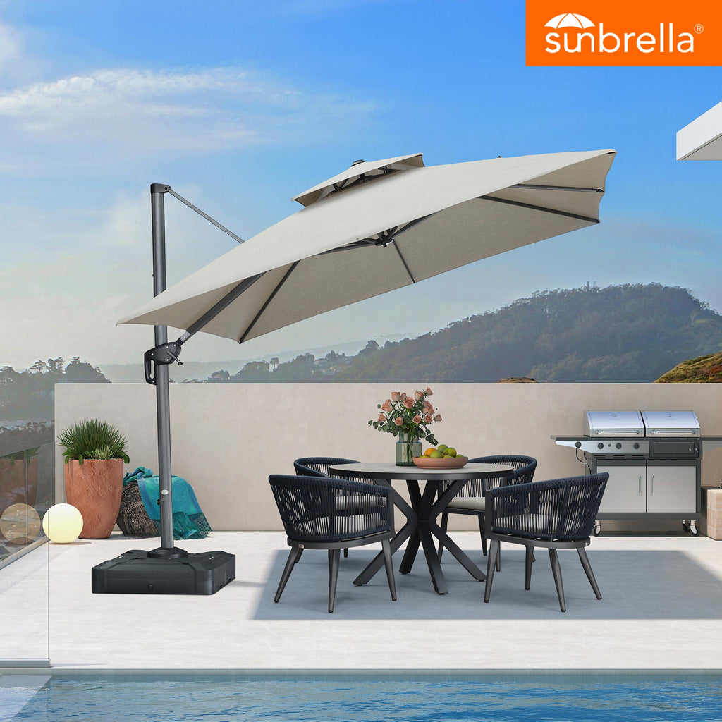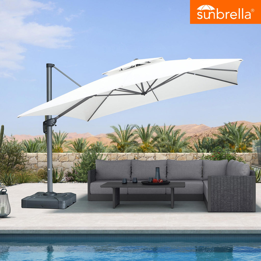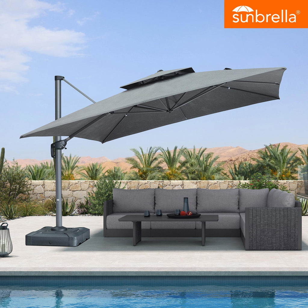 PURPLE LEAF Double Top Cantilever Umbrella is the perfect blend of style and practicality, this large dual top pool umbrella offers 360° rotation and 6 height tilts. Featuring a dual canopy system for excellent shade, the cantilever design eliminates the need for a center pole, providing you with a clear view and plenty of unobstructed seating space.