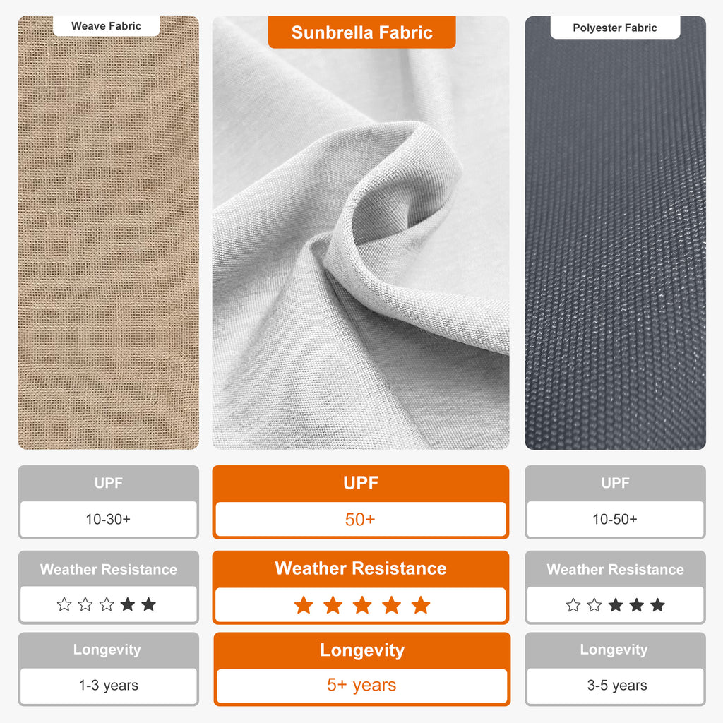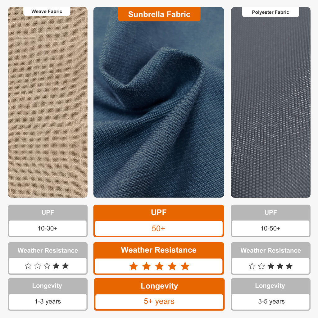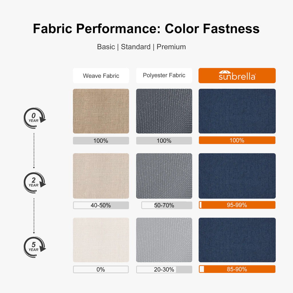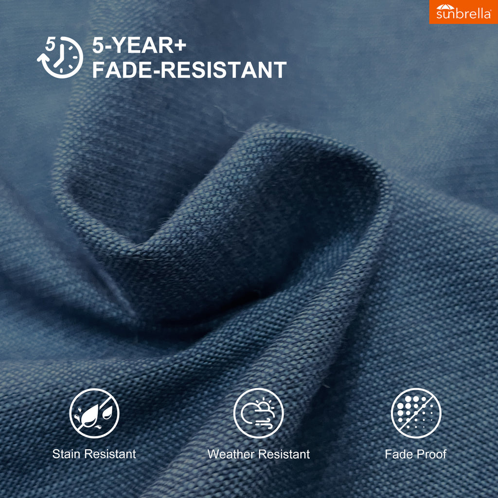 ● Upgrade Fabric: For years, no other fabric has lasted longer than Sunbrella®. High-quality, 100% SUNBRELLA fabric is UV-resistant, water-repellent and colorfast for 8 years. Available in a variety of stripes, solids and textures, it's the perfect fabric for furniture.