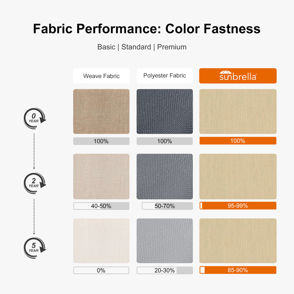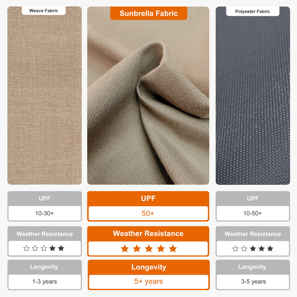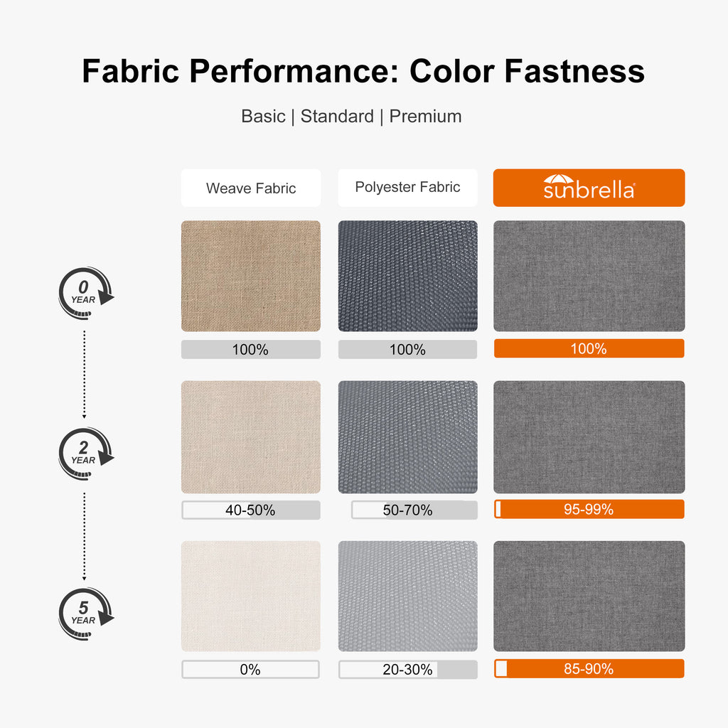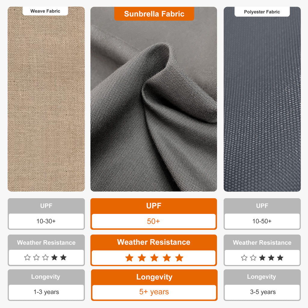 ● Upgrade Fabric: For years, no other fabric has lasted longer than Sunbrella®. High-quality, 100% SUNBRELLA fabric is UV-resistant, water-repellent and colorfast for 8 years. Available in a variety of stripes, solids and textures, it's the perfect fabric for furniture.