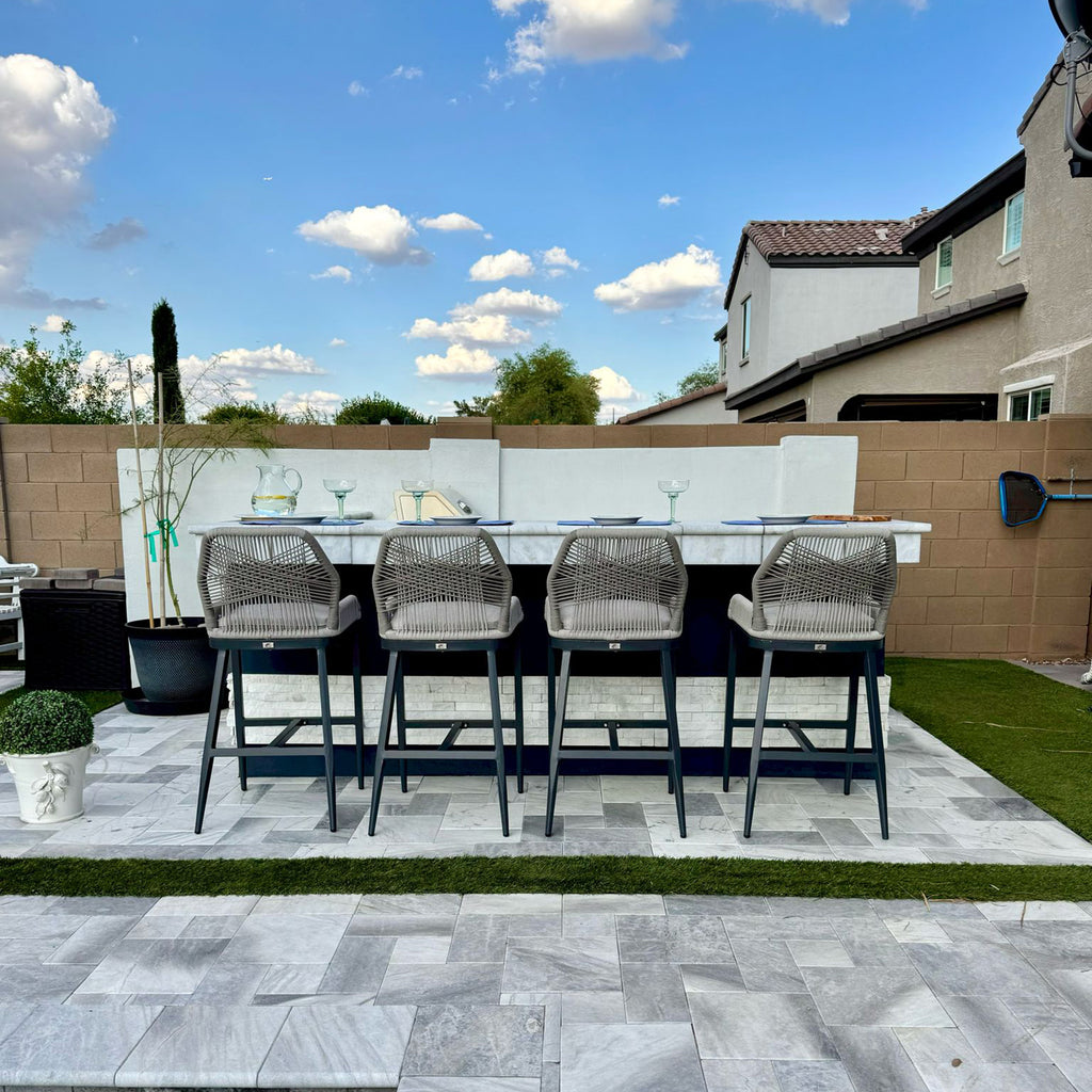 [ Elegance Design ] Hand-woven geometric backrest and simple grey frame look exquisite and unique. Armrests and footrest can help relieve more stress on your body.Ideal for outdoor patios, decks, gardens, kitchen islands and etc.