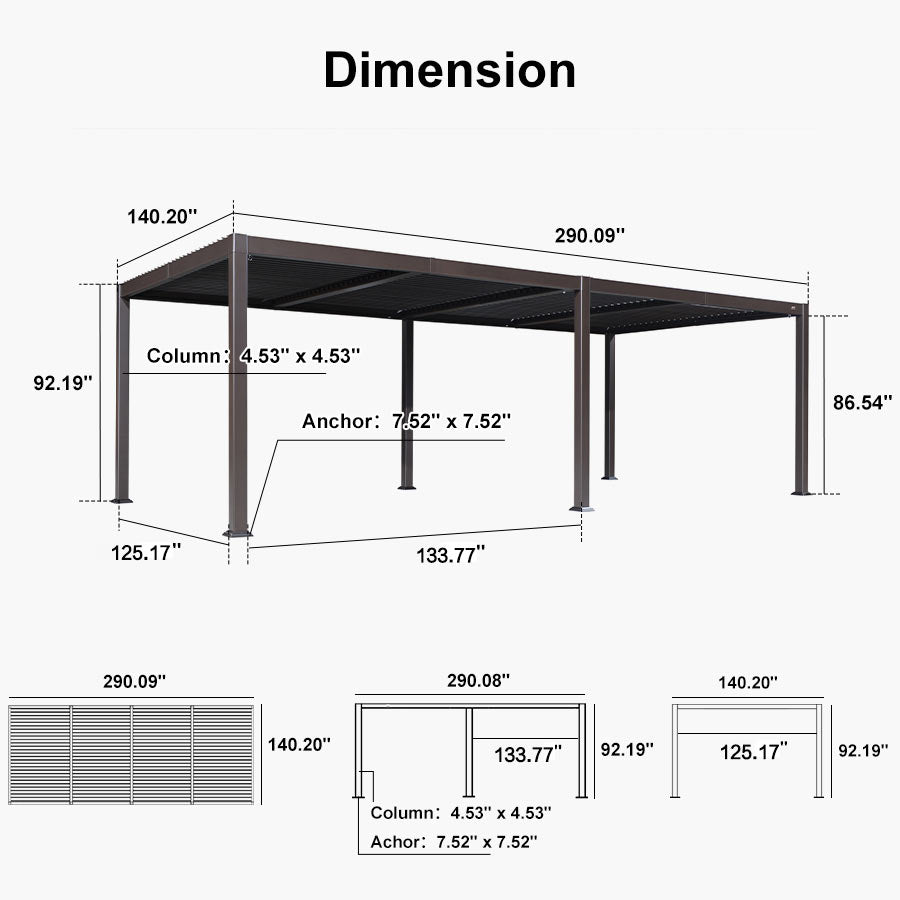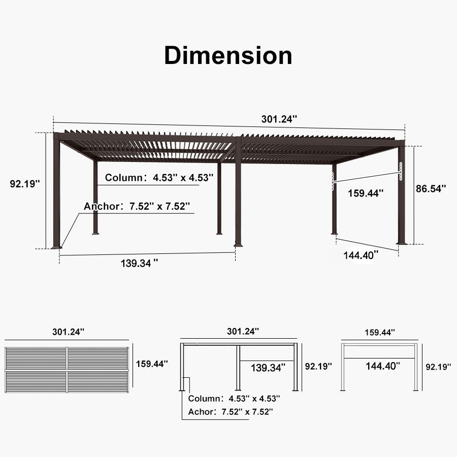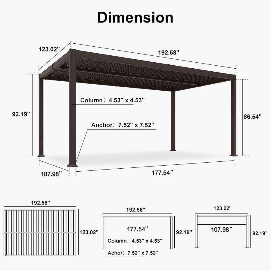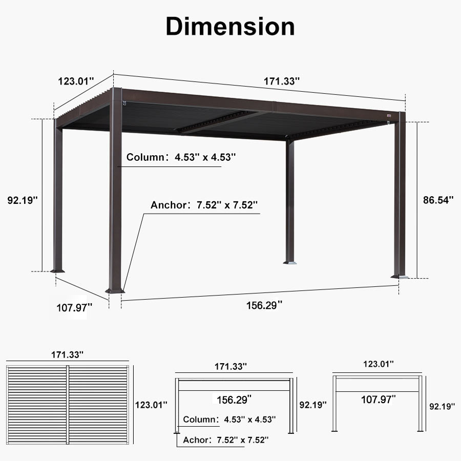 Customizable Comfort: Experience ultimate relaxation with our pergola's three rows of individually adjustable louvers, offering up to 234 square feet of shaded paradise. Whether you're seeking sunlight or stargazing, find your perfect ambiance with ease.
