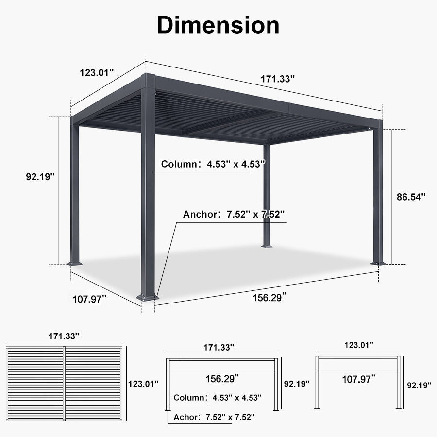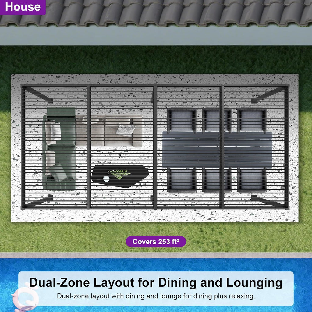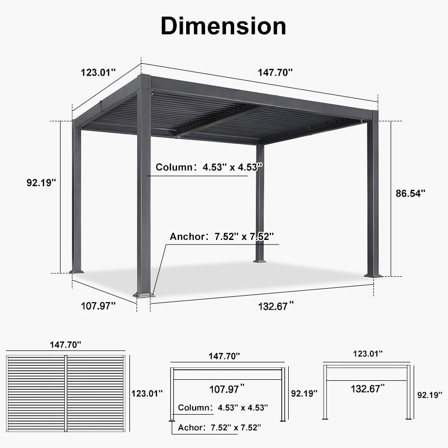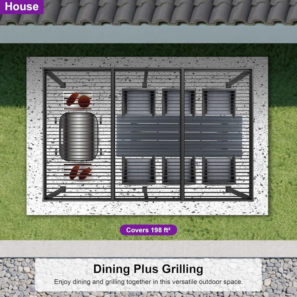 Customizable Comfort: Experience ultimate relaxation with our pergola's three rows of individually adjustable louvers, offering up to 234 square feet of shaded paradise. Whether you're seeking sunlight or stargazing, find your perfect ambiance with ease.