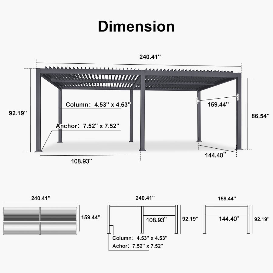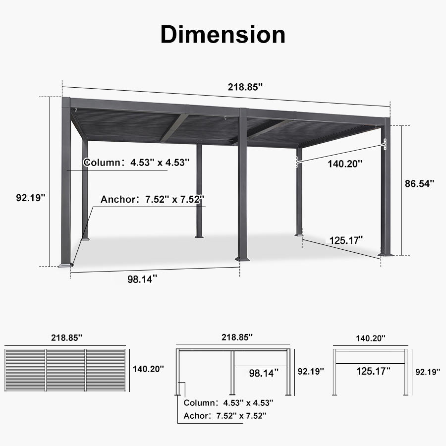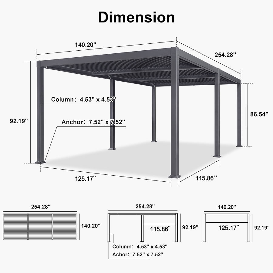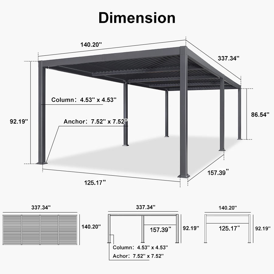Customizable Comfort: Experience ultimate relaxation with our pergola's three rows of individually adjustable louvers, offering up to 234 square feet of shaded paradise. Whether you're seeking sunlight or stargazing, find your perfect ambiance with ease.