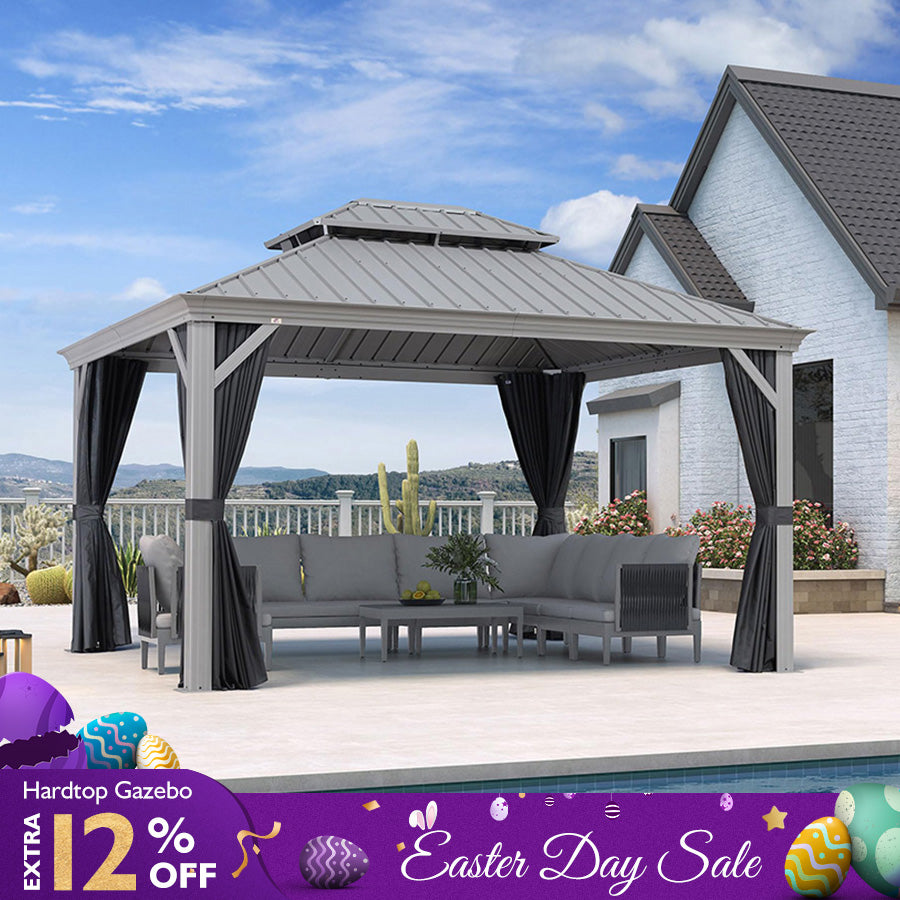 - [ Sturdy Aluminum Frame ] Our outdoor aluminum gazebo features a robust powder-coated aluminum frame. The included 12 expansion screws secure the gazebo in solid areas like concrete, adding extra durability and safety for stability in severe weather.
